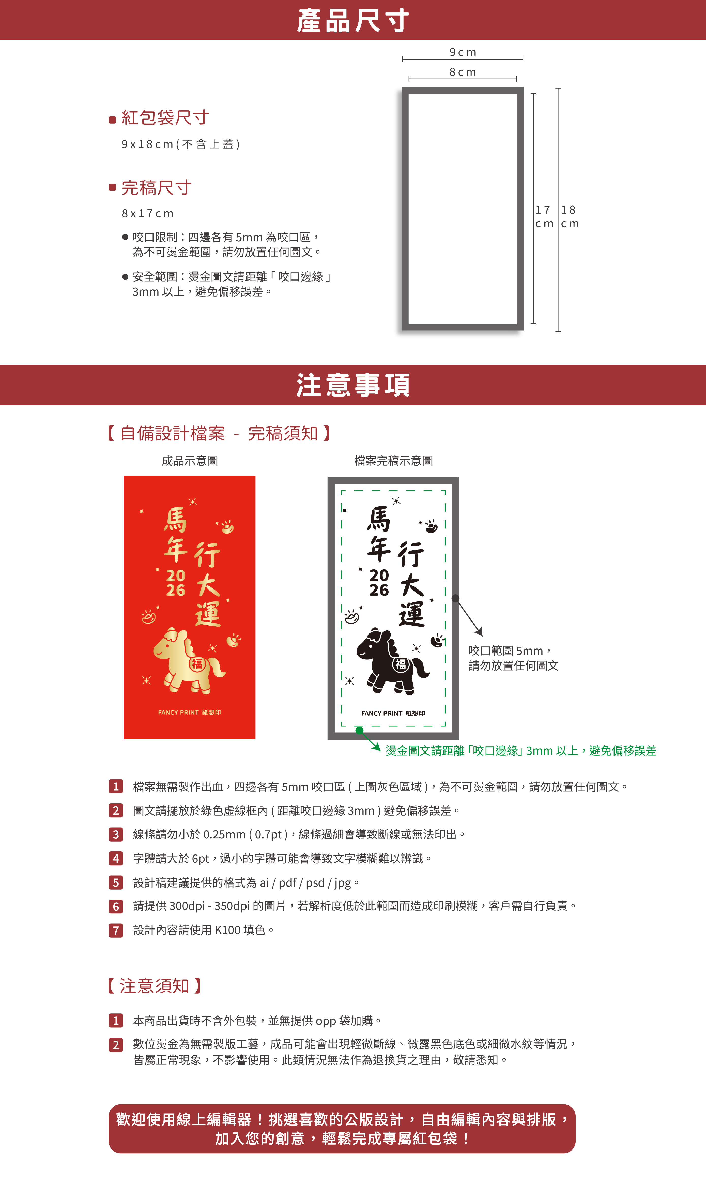- 使用線上編輯之訂單,本網站的線上編輯工具已依照印刷標準進行設置,所有設計內容在正常情況下均可順利通過自動流程。由於過程中無人工審稿服務,提交後將直接進行印刷,無法進一步檢查或修改設計內容。因此,請於下單前仔細確認設計內容的完整性、正確性及是否符合印刷完稿規範(如出血設定、圖片解析度、重要圖文需放置在安全線內等)。若成品因個人因素產生任何錯誤,相關責任將由您自行承擔。