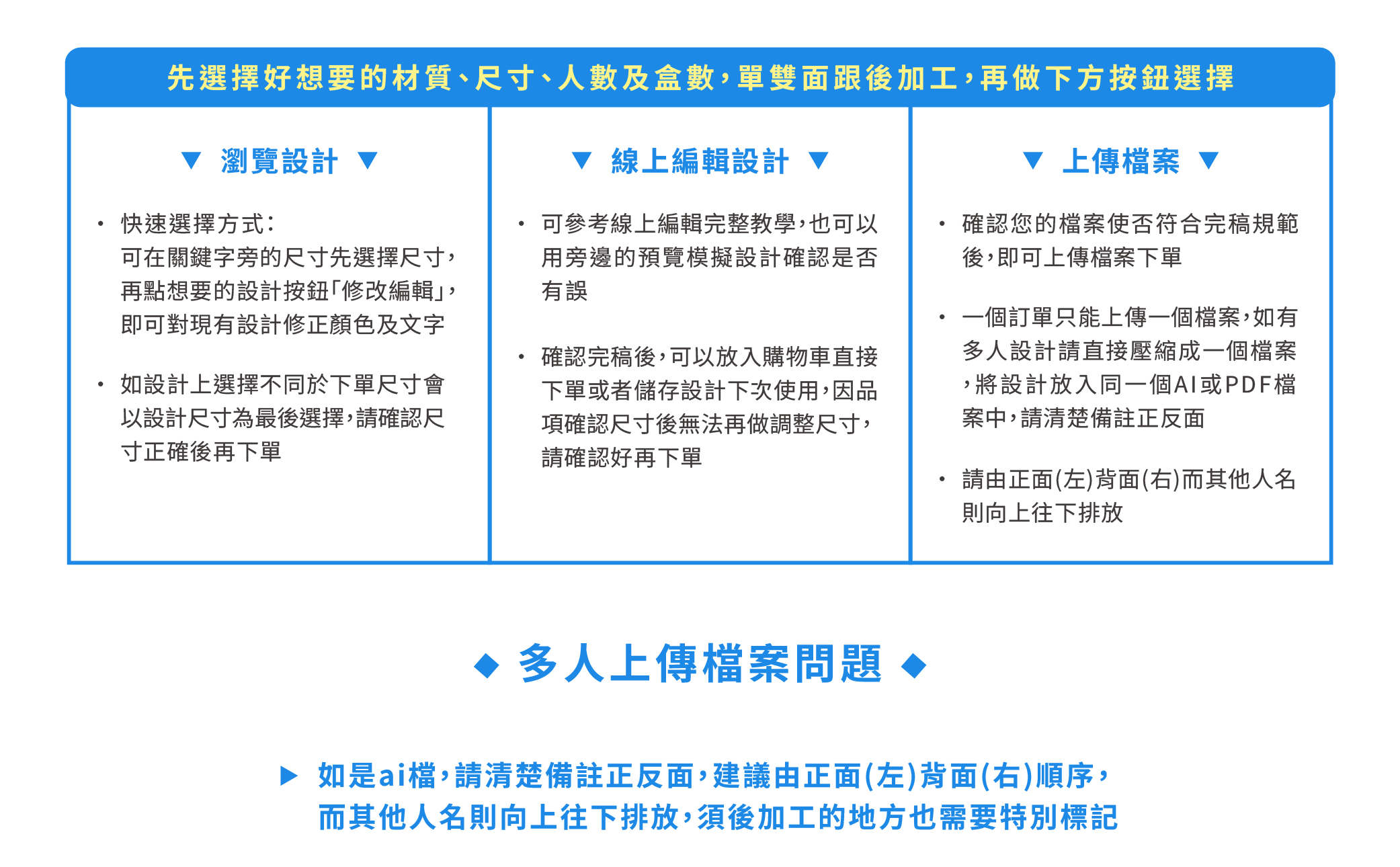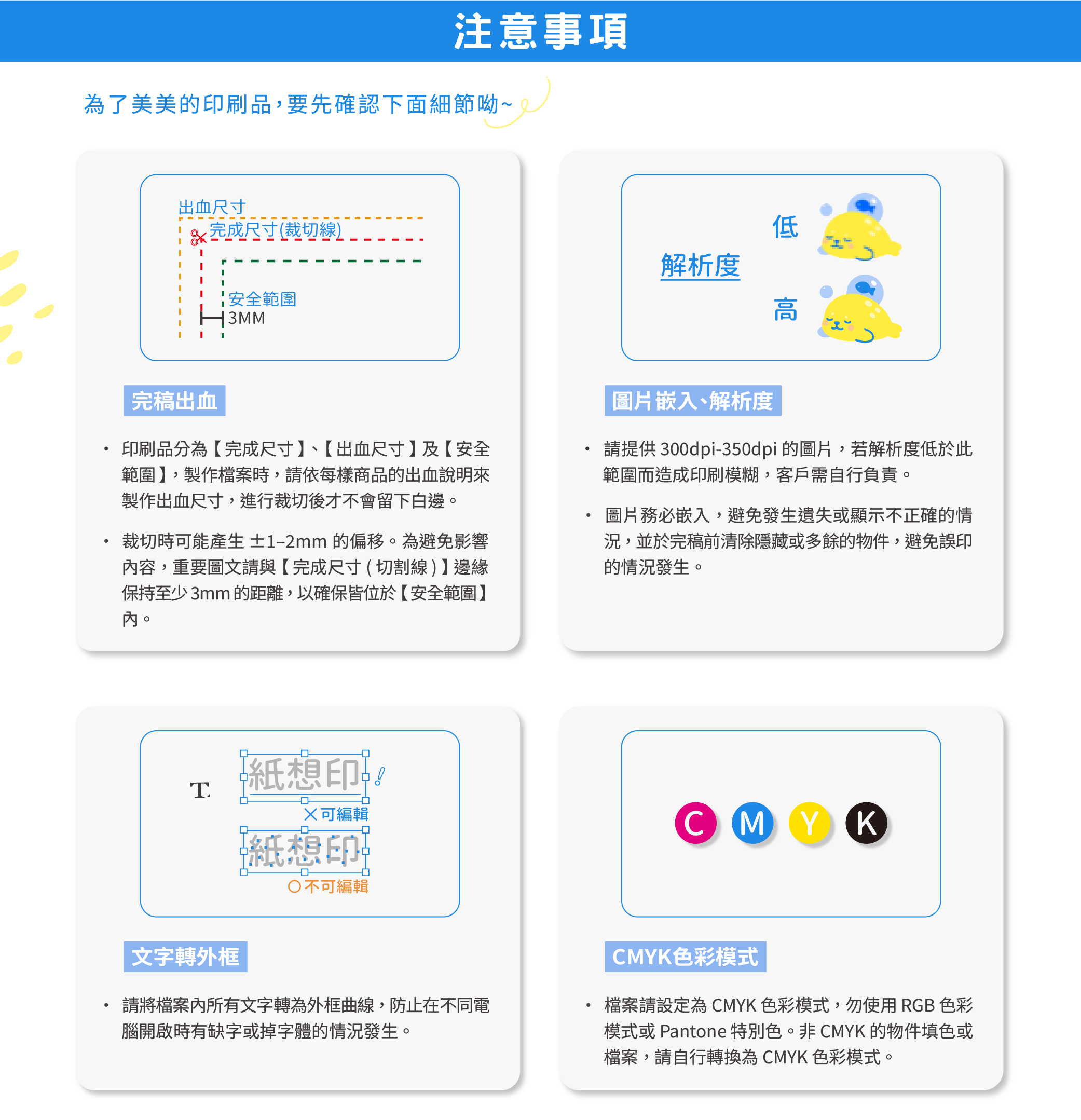 - 下單前請務必詳閱商品頁之「完稿事項」及《常見問題》內各項「印刷須知」內容,避免檔案格式不符而遭退件,並同意以其內容作為日後責任歸屬之判定依據。本網站將依據前述規範進行審稿(此服務僅適用於上傳檔案之訂單)。